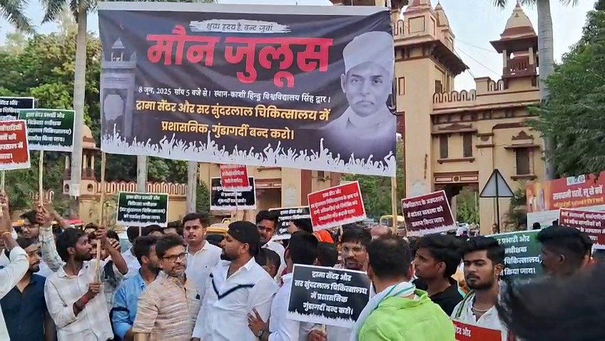 काशी हिंदू विश्वविद्यालय के BHU ट्रामा सेंटर प्रभारी को बर्खास्त करने व हॉस्पिटल से बाउंसरों को हटाने के लिए व भ्रष्टाचार के विरोध में विद्यार्थियों, पूर्व छात्र नेताओं, सामाजिक कार्यकर्ताओं व नागरिकों ने रविवार को सिंह द्वार से रविदास गेट होकर मालवीय प्रतिमा तक विशाल मौन जुलूस निकाला। जुलूस में शामिल छात्रों के बैनर पर लिखा था ’क्षुब्ध ह््रदय है बंद जुबान’।