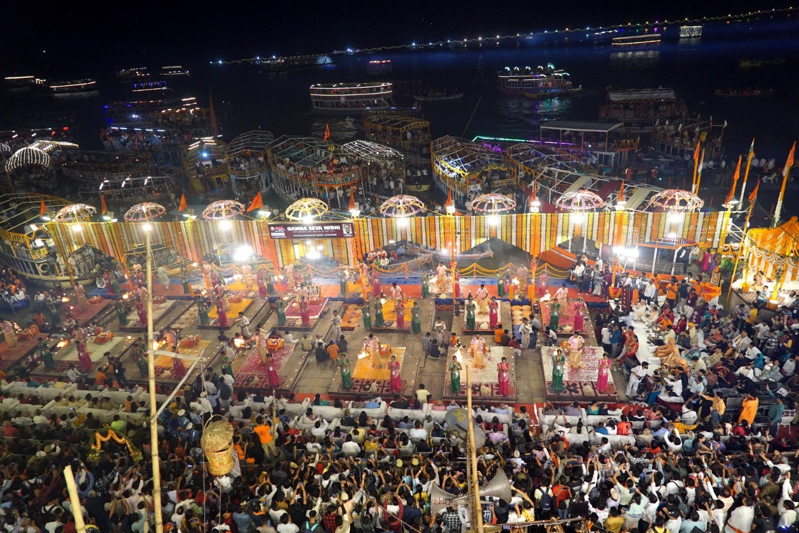 गंगा सेवा निधि के 21 अर्चकों द्वारा भगवती माँ गंगा का वैदिक रीति से पूजन किया गया। श्री राम जनम योगी द्वारा 4 मिनट 21 सेकेन्ट के शंखनाद के ध्वनि से दशाश्वमेध घाट का कण-कण मग्नमुग्ध हो गया साथ ही दुर्गा चरण इण्टर कालेज की 42 देव कन्याओं द्वारा रिद्धि-सिद्धि के रूप में ब्राह्मणों के साथ माँ भगवती की आरती सम्पन करायी गयी तथा श्री काशी विश्वनाथ डमरु दल के 10 स्वयं सेवको द्वारा माँ भगवती की भव्य महाआरती में सम्मलित हुये एवं 51 हजारों दीपों से घाट व घाटों के भवनों का कोना-कोना जगमगा हो उठा।